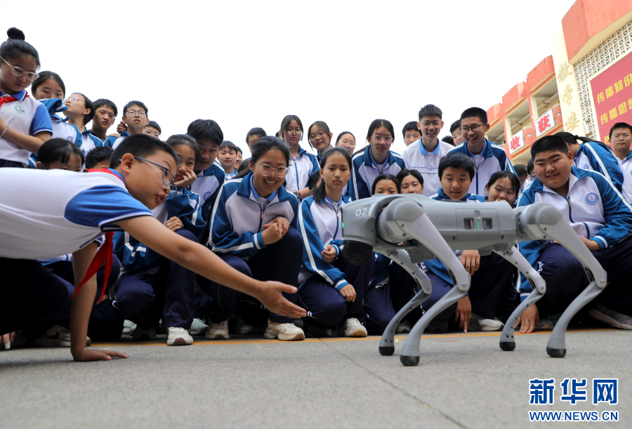 2025年5月7日,在河南省济源市轵城镇校园科技节活动上,同学们与机器狗互动。新华社发(段二平 摄)