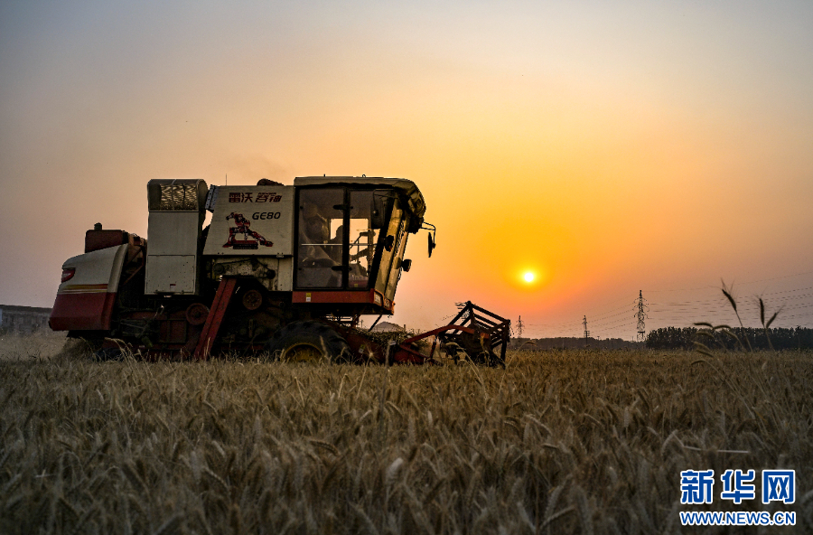2025年5月28日,在河南省商丘市夏邑县会亭镇张楼村,收割机伴着夕阳在田间收获小麦。新华社发(王高超 摄)