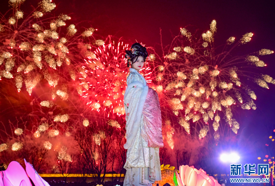 2025年1月29日,农历正月初一,一名游客在河南省洛阳市“正月烟花上洛阳”——2025洛阳新春焰火晚会上拍照留念。新华社发(李卫超 摄)