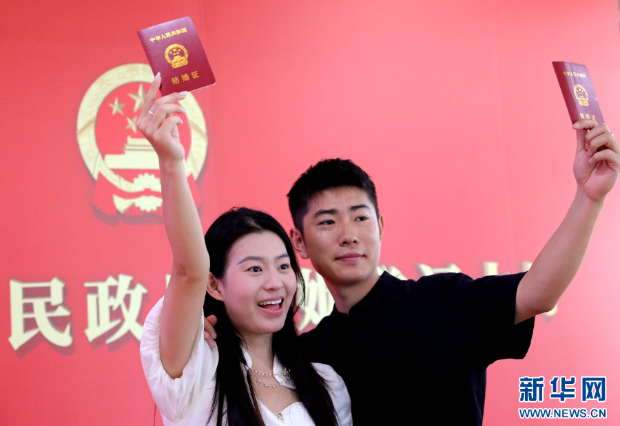 2025年8月29日,一对新人在河南省济源市民政局婚姻登记大厅领证后合影留念。又到一年七夕,甜蜜与浪漫围绕在人们身旁。新华社发(段二平 摄)