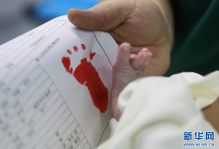 2025年1月1日,河南省平顶山市宝丰县中医院妇产科医护人员在给新生儿按脚印(获评2025年新华社年度照片)。新华社发(何五昌 摄)