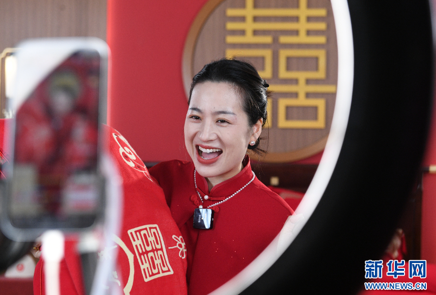 2025年11月11日,在河南省商丘市夏邑县智信电子商务中心,一家电商企业的主播在直播间推介纺织产品。新华社发(苗育才 摄)