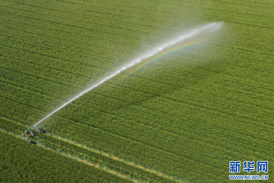 2025年5月7日,一台自走式喷灌机在河南省焦作市温县黄庄镇南韩村麦田间作业(无人机照片)。新华社发(徐宏星 摄)