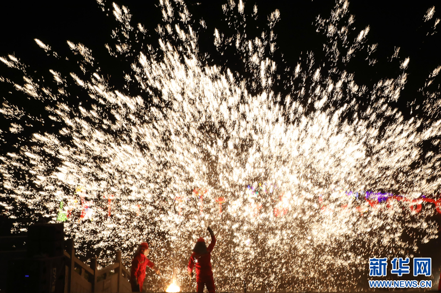 2025年2月10日晚,民间艺人在河南省焦作市温县陈家沟景区表演“打铁花”。新华社发(徐宏星 摄)