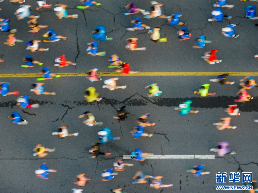 2025年11月16日,参赛选手从起点出发(无人机照片)。当日,2025郑州马拉松在郑州市郑东新区如意湖畔鸣枪开跑。比赛设置马拉松、半程马拉松两个项目,共有近2.5万人参赛。新华社发(麻翛然 摄)