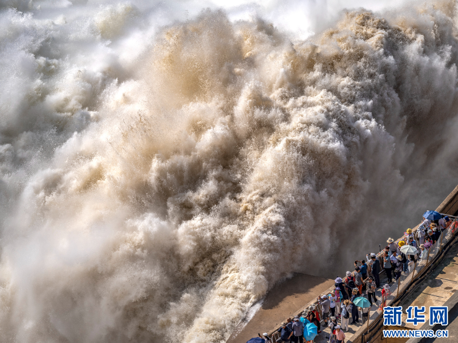 2025年7月4日,游人在三门峡水利枢纽观看调水调沙(获评2025年新华社年度照片)。新华社发(杜杰 摄)