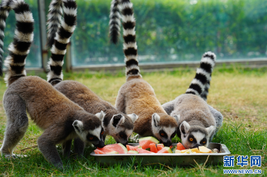 2025年6月10日,河南省沁阳市和生森林动物乐园里的环尾狐猴吃西瓜解暑。新华社发(张新雨 摄)