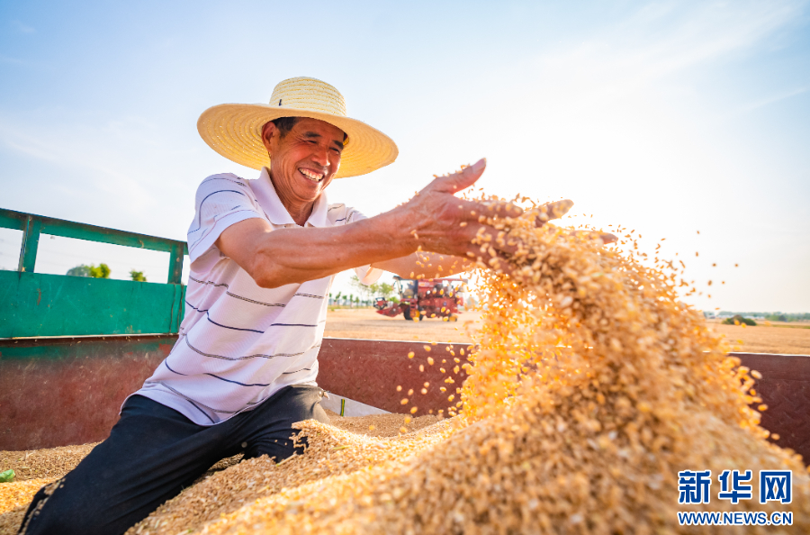 2025年5月21日,河南省商丘市夏邑县会亭镇贾楼村农民在麦田内查看麦粒饱满程度。麦收时节,各地农民抢抓农时抢收小麦,确保颗粒归仓。新华社发(王高超 摄)
