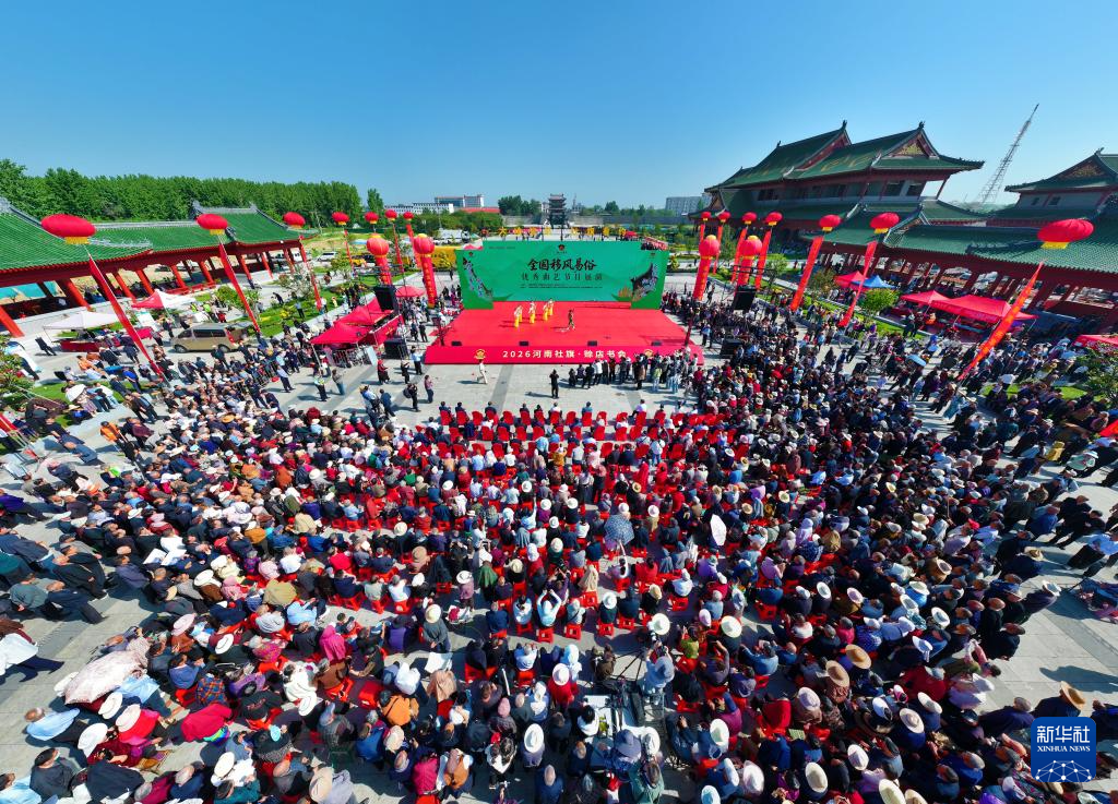4月18日,在河南省南阳市社旗县赊店古镇市民广场,演员在赊店书会系列展演活动上表演节目(无人机照片)。