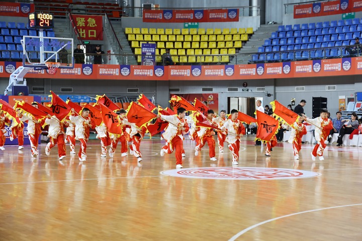 4月26日,在长垣市体育馆,少年啦啦队队员在开赛前进行表演。朱新国 摄